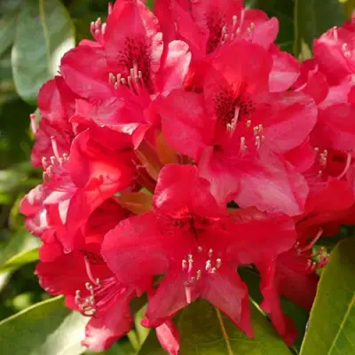 Цветы этого сорта представляют собой настоящую живопись в вашем саду. Соцветия-шары, диаметром до 14 см и высотой до 12 см, собирают до 20 крупных чашевидных цветов. Внешняя сторона лепестков имеет яркий красный оттенок, а внутренняя — насыщенно малиновый. Лепестки волнистые, что придаёт цветам особую выразительность и шарм. Цвести рододендрон начинает в мае и продолжает радовать своим цветением до июня, в течение 2-3 недель.
