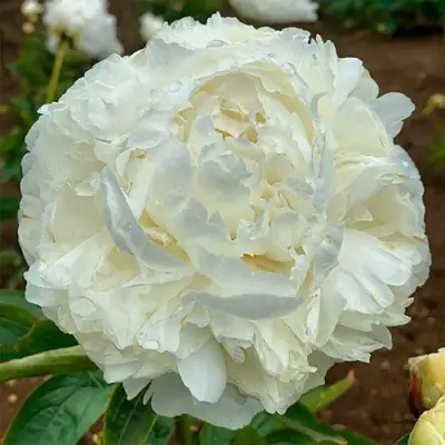 Особенное очарование пиону придают его крупные, махровые цветы диаметром 16-20 см. Кремово-бело-розовая окраска с заметными розовыми вкраплениями при роспуске создает нежный и романтичный образ. Лепестки закругленной формы, нежные и бархатистые на ощупь, добавляют цветку особую изысканность. Аромат цветов, напоминающий запах ландышей, нежно окутывает пространство, создавая непередаваемую атмосферу.