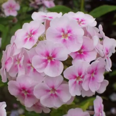 Листья флокса имеют сердцевидную форму и насыщенный темно-зеленый цвет, придавая растению ухоженный и здоровый вид. Метельчатые соцветия, наполненные крупноцветковыми цветками диаметром от 3,0 до 3,4 см, располагаются на прямостоячих стеблях, создавая красивую фоновую композицию. Особенности окраски лепестков захватывают дух: нежно-розовый цвет с ярко-розовыми штрихами напоминает цветение яблони и выглядит особенно эффектно на фоне зеленой листвы. Лепестки имеют шелковистую текстуру и приятный, хоть и легкий аромат.
