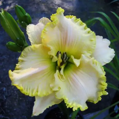Цветок лилейника Вилла Ванилла — это настоящее произведение искусства природы. Его крупноцветковые, махровые соцветия диаметром 12-13 см поражают своим разнообразием текстур и оттенков. Основная окраска в лимонно-желтых тонах с бело-желтым центром и каймой создает эффект солнечного света, который притягивает взгляды и восхищает своей красотой. Лепестки цветка оформлены гофрированным краем, что добавляет ему дополнительную объемность и привлекательность. Каждый лепесток обрамлен лимонной каймой, что подчеркивает нежность и легкость цветка.