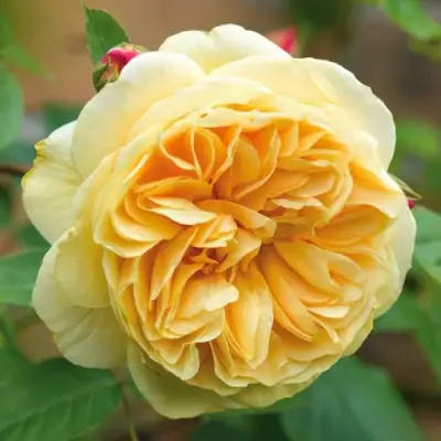 Цветки махровые, до 60 лепестков, диаметром 8–10 см, собраны в кисти по 3–5 бутонов. Центральные лепестки — густо-жёлтые, ближе к краю — кремовые, что создаёт эффект живой акварели. Обладают стойким ароматом с нотами чайной розы и медовых фруктов. Цветение длительное, волнами, с начала лета до поздней осени.