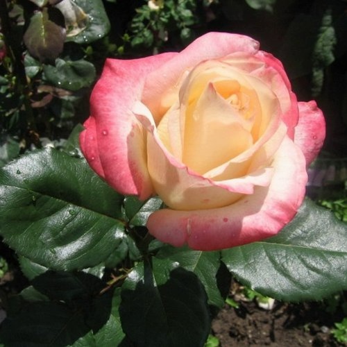 Группа чайно-гибридных роз известна своей красотой и нежностью. Роза Бела Перла не исключение. Она идеально подходит для срезки, а так же может использоваться и для одиночных, и для групповых посадок. Окраска бутона этой розы кремовая, с розовыми размывами. Кайма цветка также имеет розовый оттенок. Бутоны розы Белла Перла имеют бокаловидную форму и достигают диаметра в 9-10 см. Лепестки образуют густо махровый цветок, состоящий из до 50 лепестков. Цветки розы растут на стебле, который может содержать от 1 до 3 цветков.
