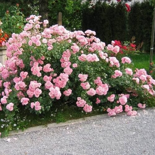 Компактный кустарник высотой до 120 см с округлой широкой кроной формирует плотные соцветия из 10–20 аккуратных розовых бутонов. Цветки среднего размера (6–8 см), махровые, с нежным розовым оттенком, который на солнце светлеет до почти кремового. Аромат мягкий, еле уловимый — не перебивает другие ароматы в саду, но даёт тонкий флёр.